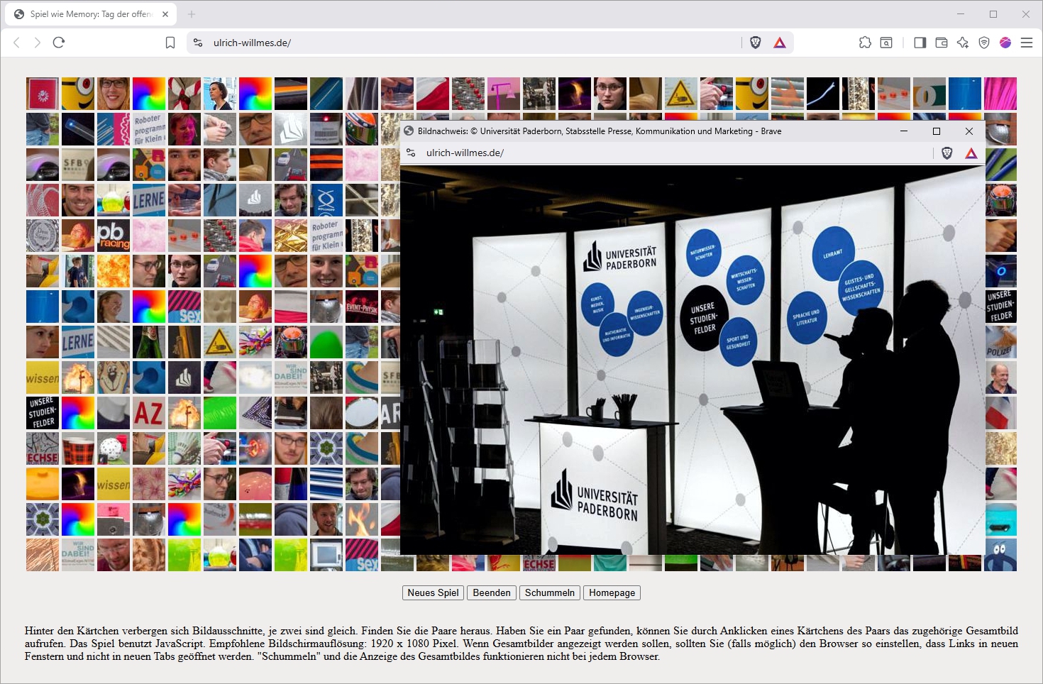 Prof. Siegert hat mir ferner ein Skript überlassen für ein Spiel mit Bildern statt Hintergrundbildern als Gesamtbilder, bei dem lediglich am Anfang des Skriptes die Anzahl der Karten sowie ein Titel und optional Texte zu den Fotos/Gesamtbildern anzugeben sind. Der Vorteil bei diesem Skript ist, dass Sie die Gesamtbilder vor dem Einsatz nicht skalieren müssen. Außerdem wurde die Verlaufsstatistik per zusätzlichem Button jederzeit abfragbar gemacht. Auch eine Speicherung des Spielstandes und eine spätere Wiederaufnahme des Spieles sind möglich – sofern Sie die Startdatei und Bilder herunterladen und das Spiel lokal auf Ihrem Rechner spielen. Die spielspezifischen Werte stehen am Anfang der Datei "start...html" im durch Kommentare gekennzeichneten Bereich. Alle Bilder werden in einem Unterordner "Bilder" gespeichert. In welchem Unterordner sich die Bilder befinden, wird im oben genannten spielspezifischen Teil angegeben und kann sehr leicht geändert werden. Die Größe jedes einzelnen Bildes kann unterschiedlich sein. Einzige Voraussetzung ist, dass die kleinen Bilder quadratisch sind. Damit alle Karten auf dem Bildschirm gleichzeitig gut sichtbar sind, können Sie bei Bedarf entsprechend dem Platz im Browserfenster jederzeit bei gedrückter Strg-Taste mit dem Mausrad den Inhalt vergrößern oder verkleinern.